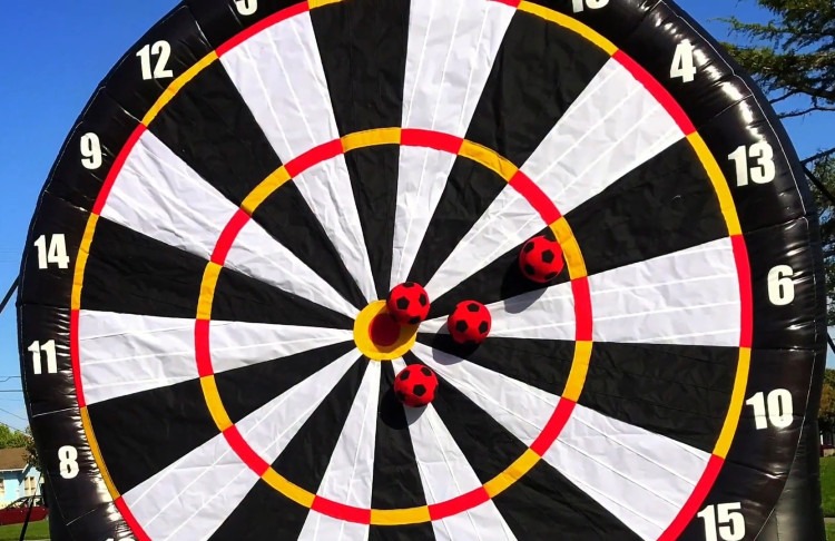 Our giant 15x4x15 inflatable Soccer Dart game is a great way to add more interactive fun to your event! Much like traditional darts, areas on the board are worth a certain number of points. Players stand a certain distance from the dartboard and take turns kicking Velcro balls at the dart board earning their points! It's interactive and provides lots of fun for children and adults alike! This game is a fun addition to your backyard family events as well as organizational and corporate events! It is great for those who yearn for competitive interaction and can be a great team building tool!