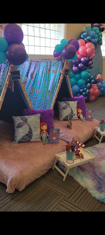 Each mermaid tent includes a sturdy, wooden A-framed tent (capped tent feet for floor protection), decorative tent cover, air mattress, fitted sheet, blanket, decorative pillows, lights, chalkboard name tag, draped netting and decor (i.e., fishing net and sea shells for the mermaid tents),a tray table, a mermaid themed night light, a wooden tray table, a snack tin, plush mermaid doll. One decorative rug is included in the rental. These items are included in the rental and will be returned after the party. A complementary mermaid themed goodie bag is provided for each child and is theirs to keep!