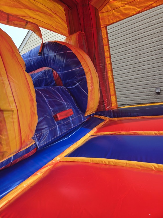Our Fun Size Single Slide/Bounce House Combo is another eye-catching inflatable that is bright, colorful, versatile and perfect for all types of events! At 23ft (L)x 11ft (W)x 14ft (H), it is slightly smaller (length and width) in size compared to our other slide/bounce house combos. Perhaps you have a smaller yard or want to accommodate the smaller children at your event. This may be the inflatable you choose! This and all of our bounce houses come equipped with a basketball hoop inside.